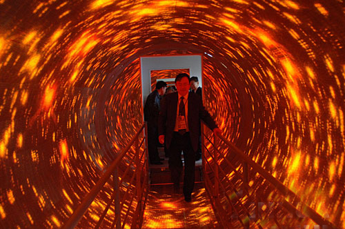 當(dāng)人沿通道橋步入隧道內(nèi),眼睛盯著旋轉(zhuǎn)的隧道內(nèi)容,人的行動(dòng)是受大腦指揮的,而大腦將接受下列信息才能發(fā)出指令:前庭覺(jué)將感受人體平衡信息(垂直或傾斜);視覺(jué)將感受人處地 ……